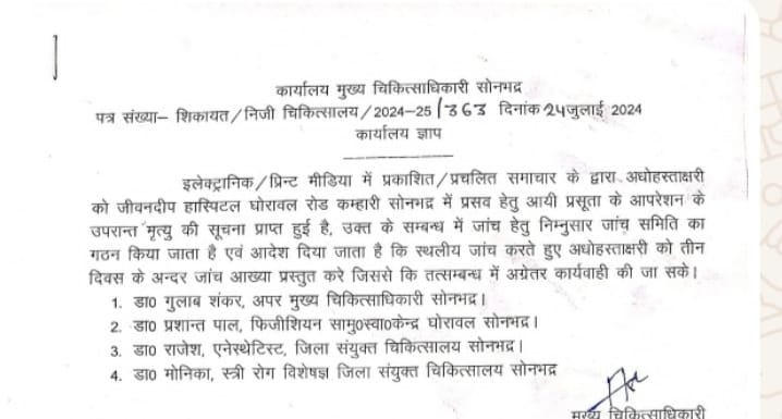 सोनभद्र- रावर्ट्सगंज में एक निजी अस्पताल के डॉक्टर की लापरवाही से प्रसूता की मौत की खबर को जिलाधिकारी ने संज्ञान लेते हुए प्रकरण की जांच हेतू टीम गठित करने का निर्देश मुख्य चिकित्सा अधिकारी को दिया था। इस दौरान प्रकरण की जांच हेतु तीन सदस्यीय टीम का किया गया गठन और तीन दिवस में रिपोर्ट प्रस्तुत करने के दिए गए निर्देश।