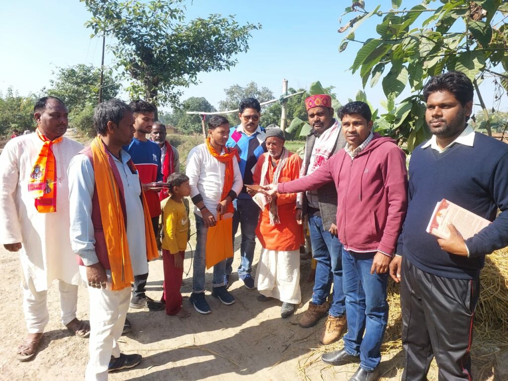 (अरविंद गुप्ता )रामगढ सोनभद्र चतरा क्षेत्र अंतर्गत विभिन्न ग्राम पंचायत में आगामी 22 जनवरी को श्री अयोध्या धाम में भगवान रामलला के प्राण प्रतिष्ठा समारोह में शामिल होने के लिए निमंत्रण दिया गया जिसमें पूजित अक्षत का वितरण शुक्रवार को किया गया चतरा खण्ड कार्यवाह लालुप्रसाद के नेतृत्व में चतरा खण्ड के डूपटिया, सोढा, पड़रीकला, सेहुआ, हरथर, सरई, डोमरिया, नेवारी, भुसौलिया, बभनियाव, बेलौडी,आदि गाँवों मे वितरण किया गया साथ मे सह खण्ड कार्यवाह राकेश चंद्रवंशी, सूर्य प्रताप सिंह, अनिल दुबे, योगेंद्र बिंद, बुधिनरायन धागर, संदीप चंद्रवंशी, पंकज सिंह, रोशन शुक्ला, चंदन , विभाग के ग्राम विकास प्रमुख अशोक चंद्रवंशी, गोविंद गुप्ता,लवकुश पाठक पर्यावरण प्रमुख सुशील पांडेय मौजूद रहे यात्रा सुरु होते ही राम भक्त झूम झूम कर आनंदित हुए हिंदू समुदाय से अपील की गई कि 22 जनवरी को अयोध्या में श्रीरामलला के प्राण प्रतिष्ठा समारोह में सभी का निमंत्रण है। इस पावन अवसर पर पूरे देश में दिन में 11 बजे से सभी मंदिरों में और घर घर में श्री राम जय राम जय जय राम जप व पूजन किया जाएगा जिसमें सभी लोग भाग लें और समारोह का सजीव प्रसारण टेलीविजन पर अवश्य देखें। इस अविस्मरणीय और ऐतिहासिक अवसर पर देश में व हिंदुओं के घरों पर रात्रि में दीप जलाकर खुशी मनाई जाएगी शुक्रवार को हर घर निमंत्रण हर घर में अयोध्या से आए अक्षत को दिया गया