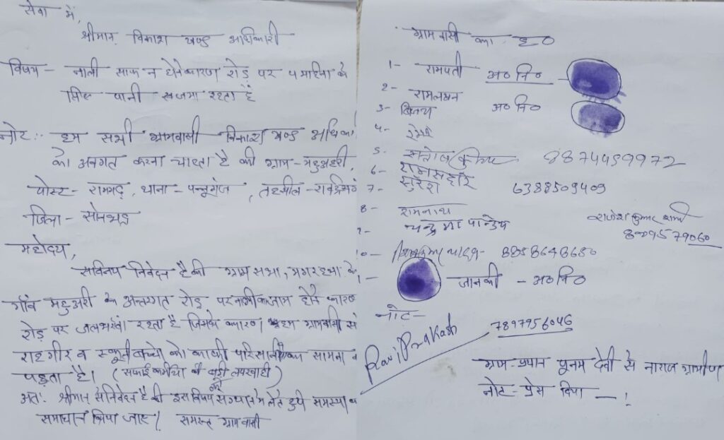 (रामगढ सोनभद्र इन्द्रेश गुप्ता) चतरा ब्लाक क्षेत्र अंन्तर्गत ग्राम मंगरहथा के ग्रामीणों ने सफाई कर्मी से परेशान होकर खण्ड विकाश अधिकारी चतरा से की गांव में साफ सफाई करवाने की मांग सरकार के स्वच्छ मिशन अभियान को पलिता लगार हे ग्राम पंचायत मे नियुक्त सफाई कर्मी सरकार के आदेश को नही मानते ग्राम पंचायत मे नियुक्त सफाई कर्मी नही साफ कर रहे गांव की नाली रोड चार माह से नाली नही किया जारहा साफ जिससे गांव मे संक्रमण फैलने की आशंका बनी है ग्रामीणों का आरोप है कि ग्राम पंचायत में सफाई कर्मी साफ सफाई नहीं कर रहे हैं और गांव में काफी गंदगी का अंबार लगा हुआ है नाली भर के बज बजा रही है जिससे गंभीर बीमारी फैलने की आशंका है ग्रामीणों ने परेशान होकर खंड विकास अधिकारी से गांव में साफ सफाई करवाने की मांग की है ग्रामीणों ने लिखित शिकायत देकर खंड विकास अधिकारी को अवगत कराया है कि नाली साफ न होने के कारण रोड़ पर 4 महिना से पानी जमा रहता है आने जाने वाले राहगीर व स्कूली बच्चो को काकी परेशानी का सामना करना पड़ता है
