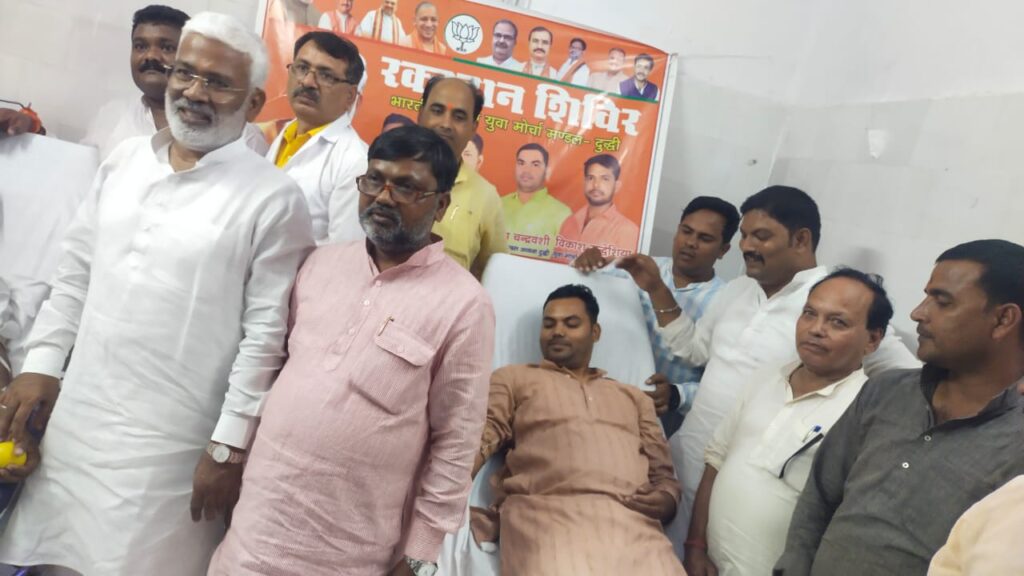 दुद्धी/ सोनभद्र (राकेश गुप्ता) प्रधानमंत्री नरेंद्र मोदी के जन्मदिन के अवसर पर चल रहे सेवा पखवाड़ा के तहत भाजयुमो की ओर से रक्तदान शिविर का आयोजन सामुदायिक स्वास्थ्य केंद्र में किया गया ।इस शिविर का उद्धघाटन उत्तर प्रदेश सरकार में जलशक्ति मंत्री स्वतन्त्र देव सिंह पटेल ने किया । इस रक्तदान शिविर में काफी संख्या में युवाओं ने रक्तदान कर पीएम मोदी के यशस्वी और दीर्घायु होने की कामना की। कार्यक्रम में बतौर मुख्यातिथि जलशक्ति मंत्री स्वत्रंत देव सिंह ने कहा कि पीएम मोदी के प्रति देश के युवाओं में एक अजब की आस्था है। साथ ही रक्तदान के महत्व पर जोर दिया और कहा कि यह हमारी सामाजिक जिम्मेदारी है कि हम रक्तदान जैसे नेक काम में भाग लें। उन्होंने कहा कहा कि हमें अपने युवाओं को रक्तदान के लिए प्रेरित करना चाहिए ताकि वे समाज की सेवा में योगदान कर सकें।यह कार्यक्रम प्रधानमंत्री नरेंद्र मोदी के जन्मदिन पर शुरू हुए सेवा पखवाड़े के तहत आयोजित किया गया था, जिसका उद्देश्य समाज की सेवा करना और रक्तदान जैसे पुनीत कार्यों को बढ़ावा देना है।इस दौरान भाजपा जिलाध्यक्ष नंदलाल चिकित्साधीक्षक डॉ शाह आलम डॉक्टर गौरव, दुद्धी विधानसभा प्रत्यासी रहे श्रवण सिंह गोंड़ अनुसूचित जाति/जनजाति आयोग के उपाध्यक्ष जीत सिंह खरवार नगर पंचायत चेयरमैन कमलेश मोहन जिलामंत्री दिलीप पांडेय, मण्डल अध्यक्ष सुमित सोनी मण्डल मण्डल उपाध्यक्ष दीपक शाह महामंत्री मनीष जायसवाल प्रेमनारायण मोनू सिंह भाजयुमो मण्डल अध्यक्ष अजय चन्द्रवँशी महामंत्री विकास मधेशिया उपाध्यक्ष विकास सोनी पीयूष कसेरा मौजूद रहे।