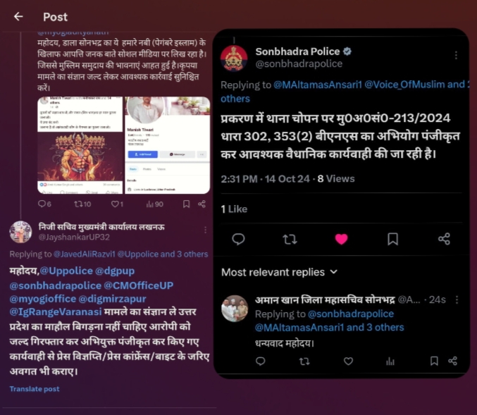 डाला/ सोनभद्र (अर्जुन सिंह) डाला भाजपा मंडल उपाध्यक्ष मनीष तिवारी ने फेसबुक के माध्यम से पैगंबर मुहम्मद को लेकर आपत्तिजनक टिप्पणी की जिसमे उन्होंने दशहरा में रावण के दहन का विरोध करते हुए धर्म समुदाय विशेष के लोगों और पैगंबर मुहम्मद के पुतले दहन करने की बात लिखी थी। मामले की गंभीरता को देखते हुए डाला चौकी प्रभारी की तहरीर पर चोपन थाने में मुकदमा दर्ज किया गया। प्रशासन ने मामले की विवेचना और सख्त कार्यवाही के निर्देश दिए है। चोपन थाना प्रभारी विजय कुमार चौरसिया ने बताया कि डाला चौकी प्रभारी शिव कुमार सिंह की तहरीर पर मनीष तिवारी द्वारा फेसबुक पर पैगंबर के संबंध में किए गए अभद्र और आपत्तिजनक टिप्पणी को लेकर सोमवार को 213 / 24 धारा 302 व 353 (2)बीएनएस की धाराओं में मुकदमा पंजीकृत कर विधिक कार्रवाई की जा रही है।
