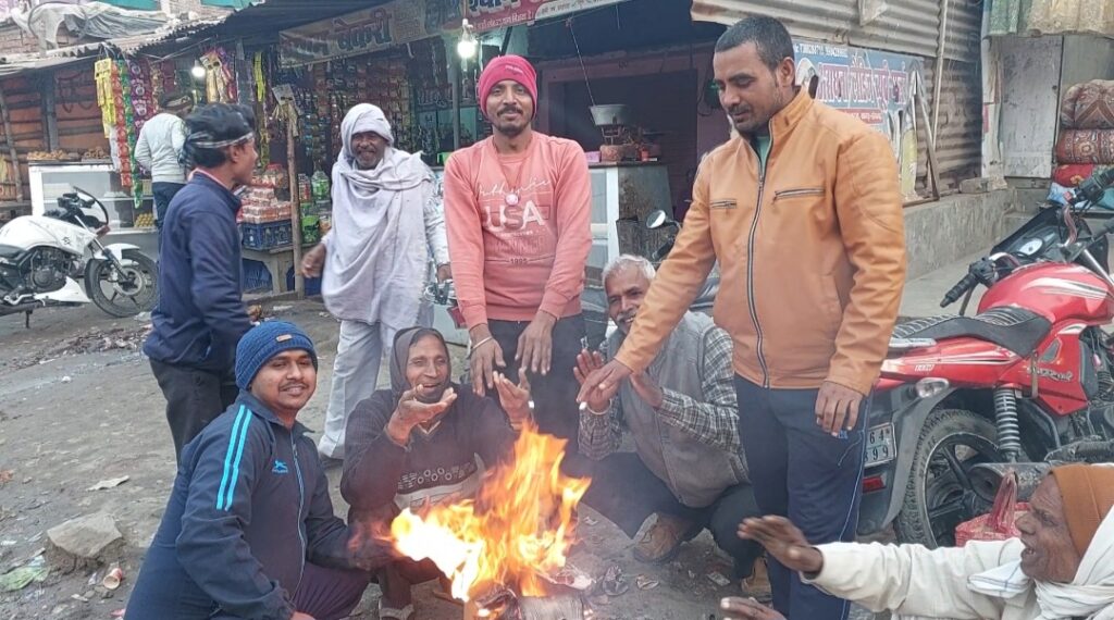 अलाव के अभाव में कंपकपाती ठंड से बचने के लिए दुकानों के अवशेष जलाने को मजबूर व्यवसायी लोगों ने प्रशासन से की अलाव जलाने की मांग