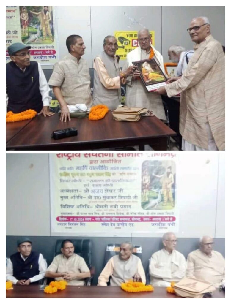 सोनभद्र। राष्ट्रीय संचेतना समिति सोनभद्र की ओर से गुरुवार को नगर पालिका परिषद के निराला सभागार में महर्षि वाल्मीकि जयंती पर ‘ रामायण की प्रासंगिकता ‘ विषय पर विद्वानों के विचार सावन की बरसात की भांति गरज चमक के साथ बरस रहे थे । वक्ताओं ने कहा- अपने पुरुषार्थ एवं साधना से ज्ञान , वैराग्य , और अध्यात्म के अप्रतिम ऊंचाई को प्राप्त करने वाले , संपूर्ण मानवता के कल्याण के लिए अपनीसशक्त लेखनी से राम कथा को अमरत्व प्रदान करने वाले महर्षि वाल्मीकि कृत रामायण के प्रसंग