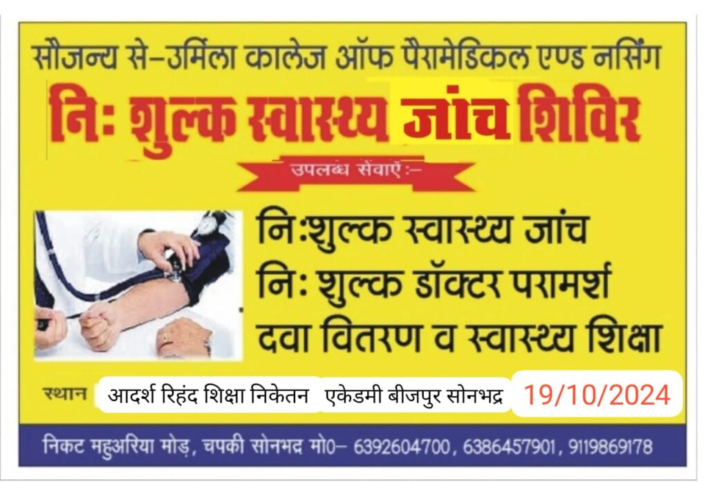 शिविर के प्रबंधनकर्ता डा.शंकर विश्वास ने इस आशय की जानकारी देते हुए बताया कि उर्मिला कॉलेज ऑफ पैरामेडिकल एवं नर्सिंग महुअरिया मोड़ चपकी के सौजन्य से प्रबंधक सुजीत दुबे के निर्देश पर शनिवार दिनांक 19 अक्टूबर को आदर्श रिहंद शिक्षा निकेतन एकेडमी पुनर्वास प्रथम बीजपुर में एक दिवसीय निशुल्क स्वास्थ्य चिकित्सा शिविर का आयोजन किया गया है जिसमे कुशल अनुभवी चिकित्सको समेत कॉलेज के नर्सिंग के छात्राओं की एक टीम मौजूद रहेगी।शिविर में आये हुए मरीजों को निःशुल्क स्वास्थ्य जांच,डॉक्टर परामर्श,दवा वितरण व स्वास्थ्य शिक्षा दिया जाएगा।शिविर का समय प्रातः 10 बजे से शाम 5 बजे तक रहेगा।उन्होंने अपील किया कि क्षेत्र के ज्यादा से ज्यादा लोग इस निशुल्क स्वास्थ्य चिकित्सा शिविर में आएं और लाभ उठाएं।
