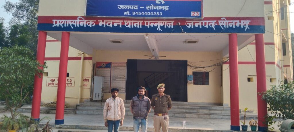 (रामगढ /सोनभद्र अखिलेश गुप्ता) पुलिस अधीक्षक सोनभद्र अशोक कुमार मीणा द्वारा अपराध एवं अपराधियों की गिरफ्तारी हेतु चलाये जा रहे अभियान के क्रम में अपर पुलिस अधीक्षक (ऑपरेशन) के निर्देशन एवं क्षेत्राधिकारी सदर के पर्यवेक्षण में थाना पन्नूगंज पुलिस द्वारा थाना स्थानीय पर पंजीकृत मु0अ0सं0-155/2024 धारा 3(1) उ0प्र0 गिरोह बन्द एवं समाज विरोधी क्रिया कलाप निवारण अधिनियम से सम्बन्धित 02 नफर अभियुक्तगण 1.राजन उर्फ राजा अली पुत्र तैय्यब अली उम्र लगभग 28 वर्ष निवासी ग्राम सेमरिया थाना रायपुर जनपद सोनभद्र, 02. संतोष मौर्या पुत्र स्व0 अवध बिहारी मौर्या उम्र लगभग 34 वर्ष निवासी ग्राम बभनियांव थाना पन्नूगंज जनपद सोनभद्र को आज दिनांक 02.12.2024 को कर्मनाशा पुल के पास से गिरफ्तार कर विधिक कार्रवाई करते हुए माननीय न्यायालय भेजा जा रहा है ।