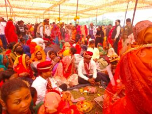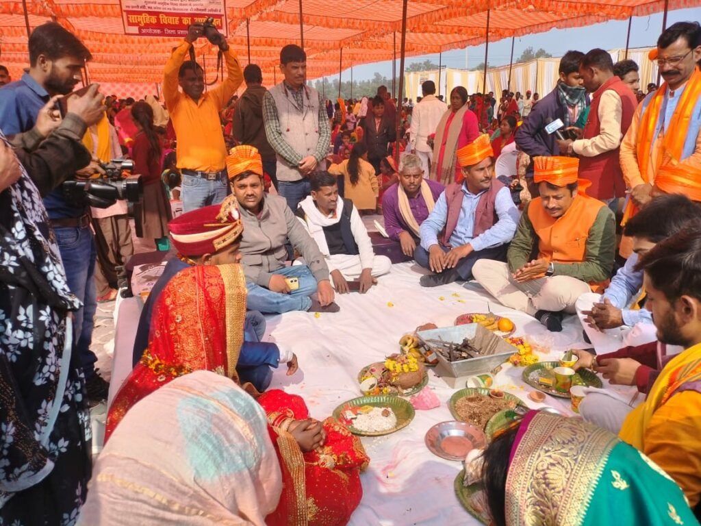 (रामगढ़) सोनभद्र- चतरा ब्लाक के राजकीय बालिका हाई स्कूल चतरा के प्रांगण में मुख्यमंत्री सामुहिक विवाह योजना के तहत सामुहिक विवाह का आयोजन चतरा ब्लाक के द्वारा किया गया जिसमें चतरा के 89 नगवां के 26 जोड़े कुल शामिल रहे सभी जोड़ों का हिंदु रिति रिवाज़ के साथ शादी सम्पन्न कराई गई जिसमें 6 मुस्लिम जोड़ो का निकाह भी निकाह रिति रिवाज से शादी कराई गई जिसमें शामिल सभी जोड़ों को सरकार की तरफ से 35 हजार का स्वीकृति पत्र एवं दस हजार रुपए का घर गृहस्थी का सामान दिया गया सरकार द्वारा हर जोड़े पर 51 हजार रुपए खर्च किया गया कार्यक्रम के मुख्य अतिथि नगवां ब्लाक प्रमुख आलोक सिंह ने कन्यादान कर वर वधू को आशीर्वाद दिया