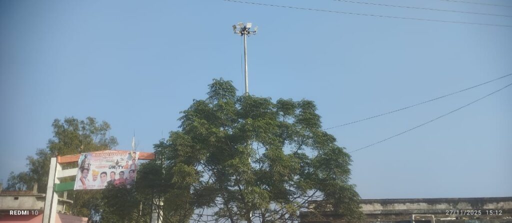 सोनभद्र। महुली क्षेत्र के प्रमुख खेल मैदान में लगी हाईमास्ट लाइटें कई महीनों से खराब पड़ी हैं। मरम्मत न होने के कारण मैदान, आसपास का बाजार और बस स्टैंड शाम ढलते ही गहरे अंधेरे में डूब जाता है। लाइटें मौजूद होने के बावजूद उनका उपयोग न होने से स्थानीय लोगों में भारी नाराजगी है।