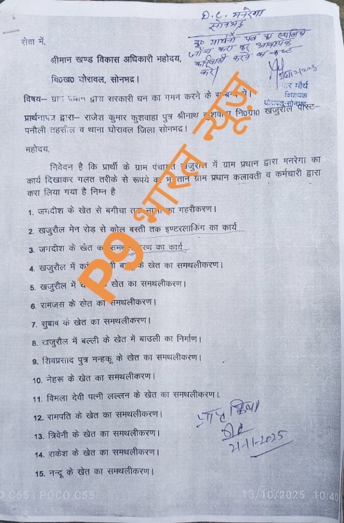 सोनभद्र। घोरावल विकास खण्ड अंतर्गत ग्राम पंचायत खजुरौल में विकास कार्यों में बड़े पैमाने पर अनियमितताएं बरते जाने का मामला सामने आया है। आरोप है कि मनरेगा सहित अन्य योजनाओं में भारी धांधली और घोटाला किया गया है, लेकिन शिकायतों के बावजूद जिम्मेदार अधिकारी कोई कार्रवाई नहीं कर रहे हैं। गांव के स्नातक दिव्यांग निवासी राजेश कुमार कुशवाहा ने खण्ड विकास अधिकारी नितिन कुमार सहित संबंधित उच्चाधिकारियों को लिखित रूप से कई बार मामले से अवगत कराया है। इसके साथ ही तहसील दिवस में भी शिकायत दर्ज कराई गई, बावजूद इसके अब तक जांच या सुधार की दिशा में कोई ठोस कदम नहीं उठाया गया। शिकायतकर्ता का कहना है कि जनहित से जुड़े मामलों में लगातार अनदेखी की जा रही है, जिससे ग्रामीणों में रोष व्याप्त है। ग्रामीणों ने मांग की है कि पूरे मामले की निष्पक्ष जांच कर दोषियों के खिलाफ सख्त कार्रवाई की जाए, ताकि विकास कार्यों में पारदर्शिता सुनिश्चित हो सके।