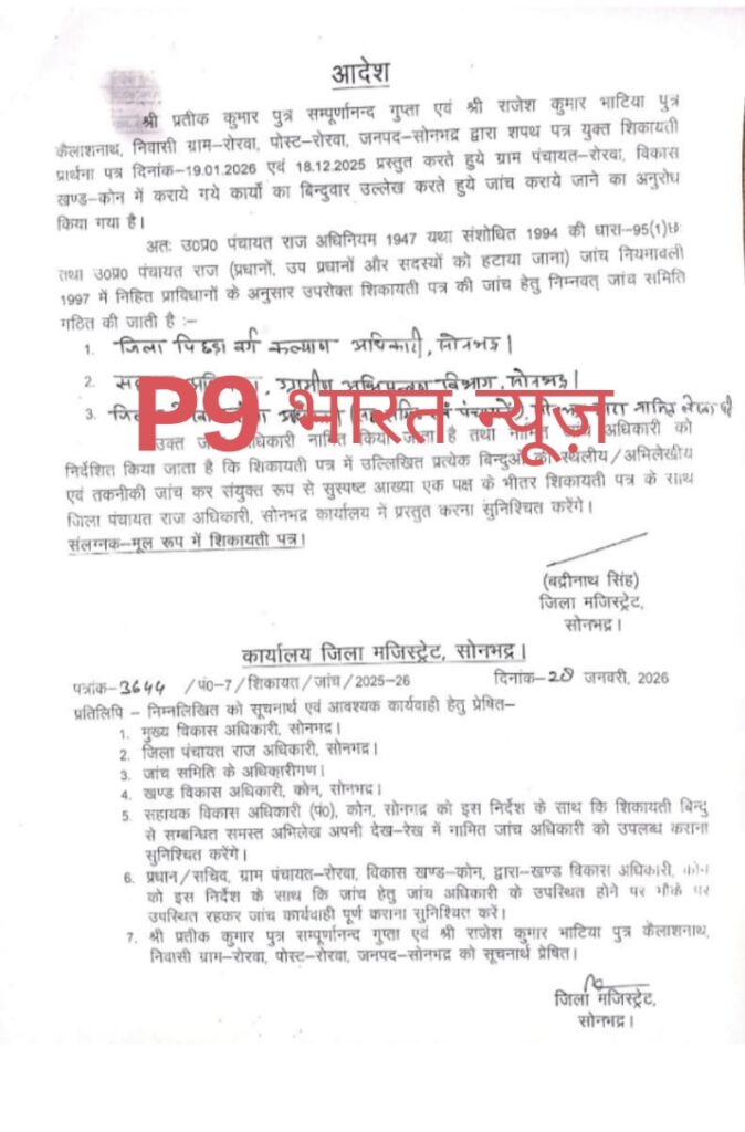 सोनभद्र। कोन (मुन्नालाल जयसवाल) ग्राम पंचायत रोरवा में ग्राम प्रधान के कार्यों की जांच को लेकर जिलाधिकारी द्वारा पारित आदेश के 15 दिन बीत जाने के बावजूद अब तक जांच समिति की तिथि निर्धारित नहीं किए जाने पर शिकायतकर्ता ने पुनः आपत्ति दर्ज कराई है। बताया गया है कि जिलाधिकारी के आदेश पत्रांक 3644/पं.-7 शिकायत/जांच 2025-26 दिनांक 28-01-2026 के अनुपालन में तीन सदस्यीय जिला जांच समिति गठित की गई थी, जिसमें जिला लेखा परीक्षा अधिकारी (सहकारी समिति एवं पंचायत), सहायक अभियंता ग्रामीण अभियंत्रण विभाग सोनभद्र तथा जिला पिछड़ा वर्ग कल्याण अधिकारी सोनभद्र को शामिल किया गया है। आरोप है कि समिति द्वारा अब तक जांच की तिथि घोषित नहीं की गई है और विभागीय स्तर पर पत्राचार के माध्यम से जांच प्रक्रिया में अनावश्यक विलंब किया जा रहा है। शिकायतकर्ता का कहना है कि अधिकारियों की देरी से ग्राम प्रधान को अधूरे कार्यों को पूरा करने का समय मिल रहा है। इस संबंध में शिकायतकर्ता ने पुनः शिकायत संख्या 40020026002468 एवं 40020026002466 के माध्यम से जिलाधिकारी के समक्ष जांच जल्द से जल्द कराने की मांग की है। शिकायतकर्ता ने चेतावनी दी है कि यदि शीघ्र जांच कर कार्रवाई नहीं की गई तो वह न्याय के लिए उच्च न्यायालय की शरण लेने के लिए स्वतंत्र होगा।
