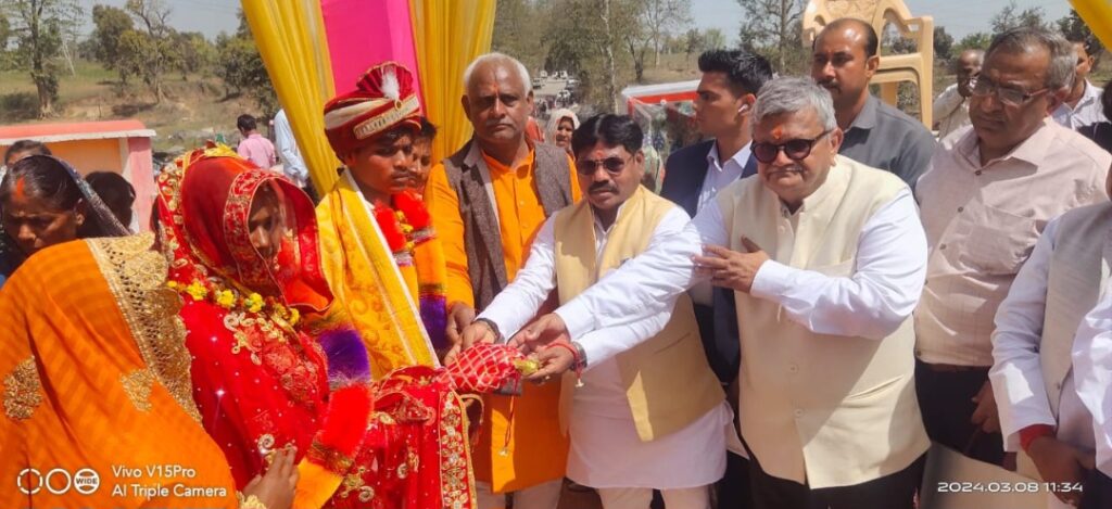 बीजपुर(विनोद गुप्त) अजीरेश्वर महादेव धाम परमार्थ जनसेवा ट्रस्ट जरहा के सौजन्य से आयोजित शुक्रवार दोपहर महाशिवरात्रि के पावन पर्व पर सामूहिक विवाह सम्मेलन में बारह जोड़े वरकन्या का विवाह वैदिक रीति रिवाज के साथ धूमधाम से सम्पन्न कराया गया। विद्वान ब्राह्मणों द्वारा मंत्रोचार के साथ बारह जोड़ी वरकन्या ने अग्रि कुंड के सात फेरे लेकर एक दूजे के संग सात जन्मों तक साथ निभाने की कसमें खाई।इस अवसर पर उपस्थित अजीरेश्वर धाम परमार्थ जनसेवा ट्रस्ट अध्यक्ष एवं न्यासकर्ता राजेन्द्र सिंह बघेल , मुख्य अतिथि उत्तर प्रदेश सरकार राज्य मंत्री संजीव सिंह गोड़, सहअतिथि एसडीएम दुद्धि सुरेश राय,ब्लाक प्रमुख म्योरपुर मानसिंह गोड़, बनवासी कल्याण आश्रम कारीडॉड से आनन्द जी,ओमप्रकाश गोयल ने सभी नवयुगल वर बधू को विवाह के पश्चात प्रमाण-पत्र देकर आशीर्वाद देते हुए सभी के सुखमय जीवन की मंगल कामना की। अंत मे ट्रस्ट की ओर से वरकन्या पक्ष से आये सभी मेहमानों को भोजन के बाद बिवाह में दान दाताओं द्वारा वरकन्या को दैनिक जीवन मे दी गयी उपयोगी वस्तुओं को देकर विदाई की गयी।
