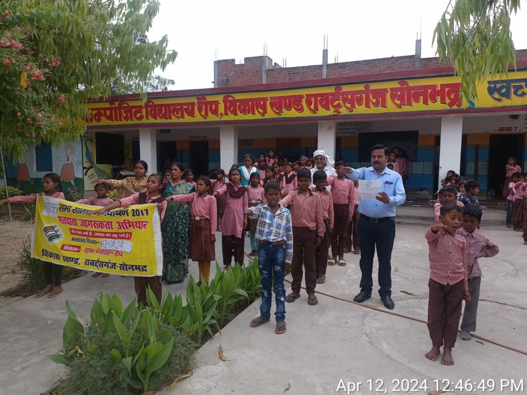सोनभद्र- जिला निर्वाचन अधिकारी चंद्र विजय सिंह के निर्देशन में आज विशेष मतदाता जागरूकता कार्यक्रम जनपद के राबर्ट्सगंज विकास खण्ड के BRC प्रांगण में स्थित कंपोजिट विद्यालय रौप में आयोजित किया गया। गत चुनावो में अपेक्षित प्रतिशत से कम मतदान वाले समस्त चिन्हांकित बूथों हेतु मतदाता जागरूकता अभियान संचालित कराने क्रम में जिला बेसिक शिक्षा अधिकारी नवीन के निर्देश पर प्राथमिक एवं उच्च प्राथमिक विद्यालय रौप के छात्र-छात्राओं के संयुक्त तत्वाधान में मतदाता जागरूकता कार्यक्रम का आयोजन किया गया। इस मौके पर sveep नोडल शिक्षक आनंद त्रिपाठी द्वारा उपस्थित शिक्षक, शिक्षिकाओ एवं जनसमूह को मतदान हेतु शपथ दिलाई गई साथ ही स्वयं मतदान करने एवं आसपास के लोगों को मतदान हेतु जागरूक करने का संदेश भी दिया गया।
