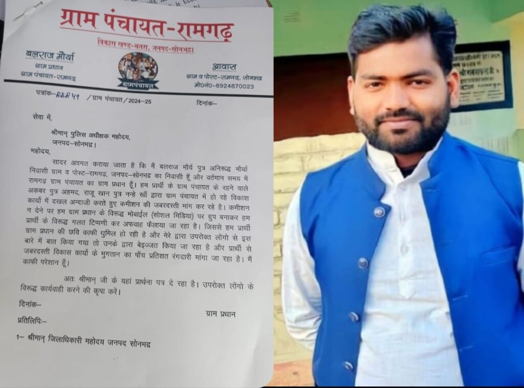 (प्रमोद गुप्ता )सोनभद्र नपद के चतरा विकास खंड के रामगढ़ के ग्राम प्रधान बलराज मौर्य से गांव के कुछ लोगो के द्वारा गांव के विकास कार्यों के लिए आए पैसे का रंगदारी मांगा जारहा है पीड़ित ग्राम प्रधान बलराज मौर्य ने पुलिस अधीक्षक सोनभद्र को दिए गए शिकायती पत्र में बताया की गांव के अकबर अंसारी व राजू खान के द्वारा ग्राम प्रधान की छबि धूमिल करने के लिए एक ग्रुप बनाकर सोशल मीडिया के माध्यम से भ्रामक और खड्यंत्र के तहत अफवाहें फैलाकर तरह तरह की मनगढंत अफवाहें फैलाई जा रही है, जिससे ग्राम प्रधान सहित ग्रामवासी भयभीत है वही ग्राम प्रधान ने यह भी बताया की उपरोक्त लोगो के द्वारा 5 प्रतिशत रंगदारी भी मांगा जा रहा है नही देने पर सोशल मीडिया पर अभद्र भाषा का प्रयोग किया जा रहा है, जिसका स्क्रीन शॉट भी मौजूद है! ग्राम प्रधान बलराज मौर्य के द्वारा उपरोक्त लोगो के विरुद्ध पुलिस अधीक्षक सोनभद्र से करवाई की मांग की गई है ग्राम प्रधान बलराज मौर्य ने बताया कि इस तरह के खड्यंत्र से मेरी छवि काफी धूमिल हुई है और मैं काफी आहत हुं सरकारी कार्य बाधित हुआ है मेरे साथ कभी भी बड़ी वारदात हो सकती है