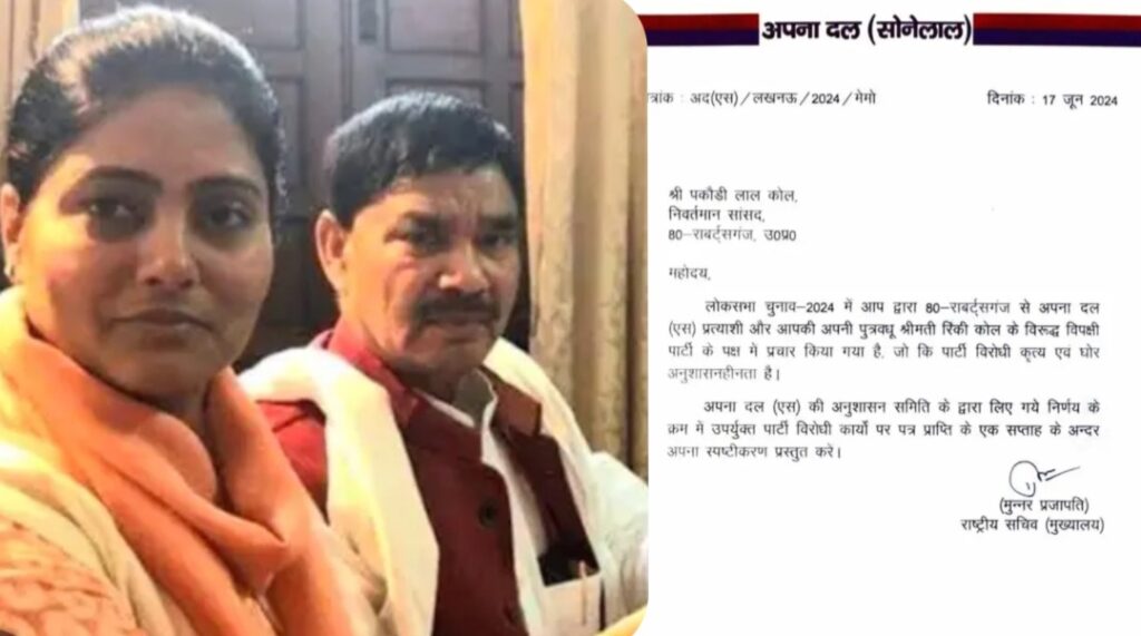 लोक सभा चुनाव 2024 लोकसभा चुनाव में भारतीय जनता पार्टी राष्ट्रीय जनतांत्रिक गठबंधन में साझेदार अपना दल सोनेलाल ने मीरजापुर (79) और रॉबर्ट्सगंज (80) लोकसभा निर्वाचन क्षेत्र में प्रत्याशी उतारा था मीरजापुर से अपना दल सोनेलाल की नेता और केंद्रीय मंत्री अनुप्रिया पटेल खुद मैदान में थीं वहीं रॉबर्ट्सगंज लोकसभा क्षेत्र से रिंकी कोल उम्मीदवार थीं रिंकी कोल को प्रत्याशी बनाने के साथ ही इस सीट पर कलह मच गई थी अब अपना दल एस से पूर्व सांसद पकौड़ीलाल कोल को पार्टी ने नोटिस दिया है लोकसभा चुनाव में रॉबर्ट्सगंज से प्रत्याशी रही रिंकी कोल के विरुद्ध विपक्षी पार्टी के पक्ष में प्रचार करने को लेकर नोटिस थमाया गया है अपना दल ने नोटिस में कहा पकौड़ी लाल अपनी ही पुत्र वधू के खिलाफ चुनाव में प्रचार करने को लेकर अपना दल सोने लाल ने नोटिस दिया है अपना दल सोनेलाल के राष्ट्रीय सचिव मुन्नर प्रजापति हस्ताक्षरित चिट्ठी में कहा गया है- लोकसभा चुनाव 2024 में आप द्वारा 80- रॉबर्ट्सगंज में अपना दल (एस) प्रत्याशी और अपनी पुत्रवधु रिंकी कोल के विरुद्ध विपक्षी पार्टी के पक्ष में प्रचार किया गया है जो कि पार्टी विरोधी कृत्य एवं घोर अनुशासनहीनता है. अपना दल एस की अनुशासन समिति के द्वारा लिए गए निर्णय के क्रम में उपर्युक्त पार्टी विरोधी कार्यों पर पत्र प्राप्ति के एक सप्ताह के अंदर स्पष्टीकरण प्रस्तुत करें.इस सीट पर अपना दल एस की प्रत्याशी रिंकी दूसरे नंबर पर थीं. वहीं समाजवादी पार्टी के छोटेलाल खरवार ने जीत दर्ज की रिंकी कोल को 3 लाख 36 हजार 614 वोट मिले थे वहीं छोटे लाल को 4 लाख 65 हजार 848 मत मिले थे छोटेलाल ने रिंकी को 1 लाख 29 हजार 234 मतों से हराया