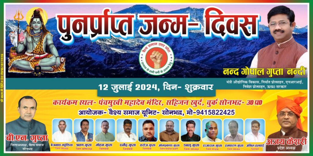 सोनभद्र।उत्तर प्रदेश सरकार मे लोकप्रिय कैबिनेट मंत्री नंद गोपाल गुप्ता “नन्दी” का पुर्नजन्मप्राप्त महोत्सव 12 जुलाई दिन शुक्रवार को समय तकरीबन दोपहर 11 बजे पंचमुखी महादेव मंदिर सहिजन खुर्द, चुर्क, मे वैश्य समाज उत्तर प्रदेश के सोनभद्र जिलाध्यक्ष बीएन गुप्ता के नेतृत्व मे महोत्सव मनाया जाएगा। उन्होने बताया की 12 जुलाई 2010 को तत्कालीन बसपा सरकार में कैबिनेट मंत्री रहे नंद गोपाल गुप्ता ‘नंदी’ पर दिन के करीब 11बजे तब रिमोट बम से जानलेवा हमला हुआ था जब वे मनोकामना सिद्ध प्राचीन शिव मंदिर में दर्शन करके घर लौट रहे थे। दिल्ली के डॉक्टरों की कड़ी मशक्कत के बाद उनकी जान बच सकी थी। सात माह सात दिन बाद अस्पताल मे गंभीर अवस्था मे भर्ती रहने के बाद जीवन से संघर्ष कर अपने घर लौटे थे, नंदी ने पूरी तरह स्वस्थ होने के बाद 2012 से 12 जुलाई को अपना पुर्नजन्मप्राप्त दिवस शुरू किए धीरे-धीरे इसे महोत्सव के रूप में आयोजित किया जाने लगा। उन्होने सभी वैश्य समाज से जुड़े सभी संगठनो एंव सर्वसमाज के लोगो से अपील की है समय से उपस्थित होकर कार्यक्रम को सफल बनाए। उक्त जानकारी वैश्य समाज सोनभद्र के जिला मीडिया प्रभारी ओमप्रकाश गुप्ता ने दी है।